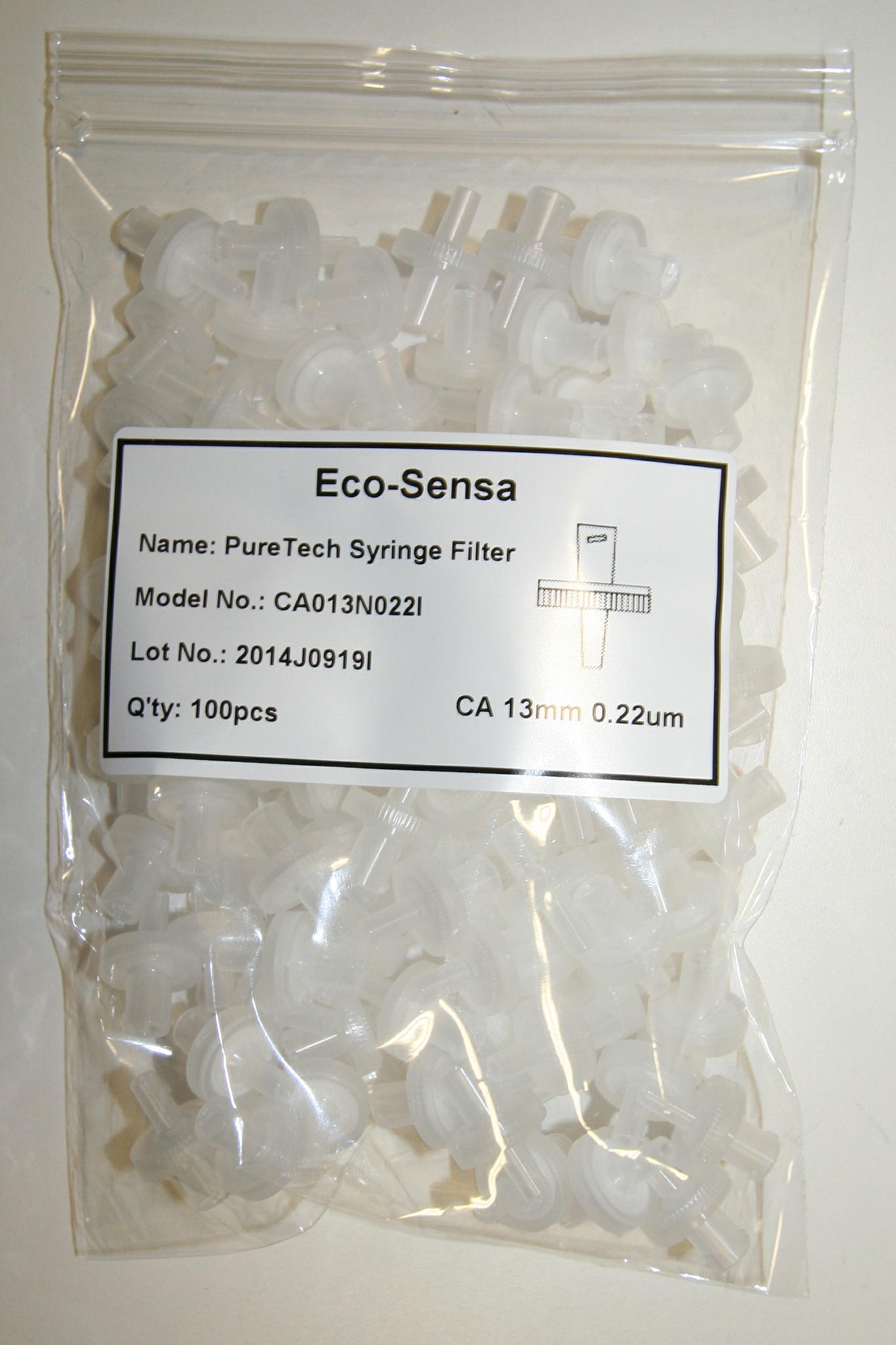 Eco-Sensa® CA Syringe filters are suitable for the filtration of aqueous solutions. Cellulose Acetate combine high flow rates and thermal stability with very low absorption characteristics. Especially 0.22μm pore size CA Membrane excellently suited for sterilization aqueous solutions, buffers, sera and media