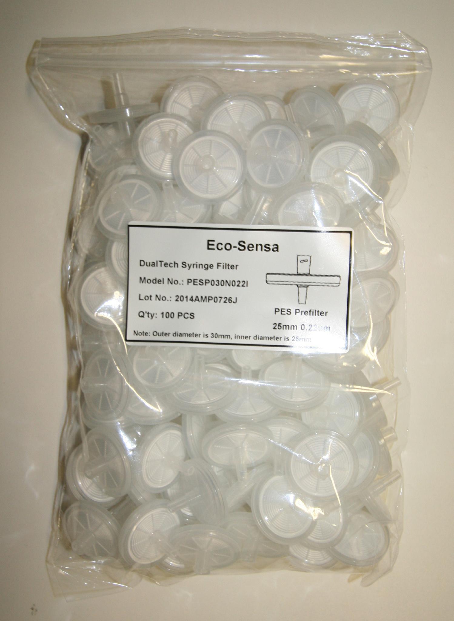 Eco-Sensa® PES Syringe Filter use unique PES membrane as filter media. PES(Polyethersulfone) – low affinity for proteins and extractable with substantially faster flow rates than PVDF; suitable for pre-filtration and filtration of buffers and culture media.