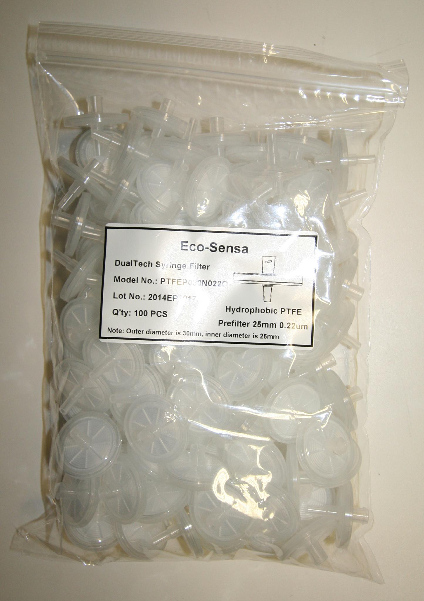 Eco-Sensa® clear hydrophobic PTFE syringe filters are designed to provide fast and efficient filtration of aqueous and organic solutions. The synringe filter use special hydrophobic PTFE membrane as the filter medium. This material has a broad chemical compatibility and high pH resistance and are optically clear when wet with water. Hydrophobic PTFE syringe filter is a versatile filter for aqueous and aggressive organic solvent-based solutions. And it is especially ideal for HPLC sample preparation.