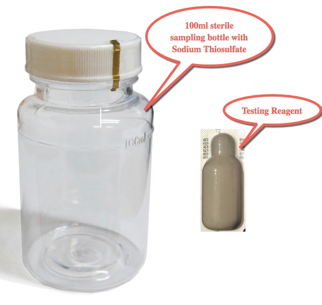 The 100ml Sterile Sampling bottle has 75mg Sodium Thiosulfate, used to neutralize chlorine in city water and pool water.