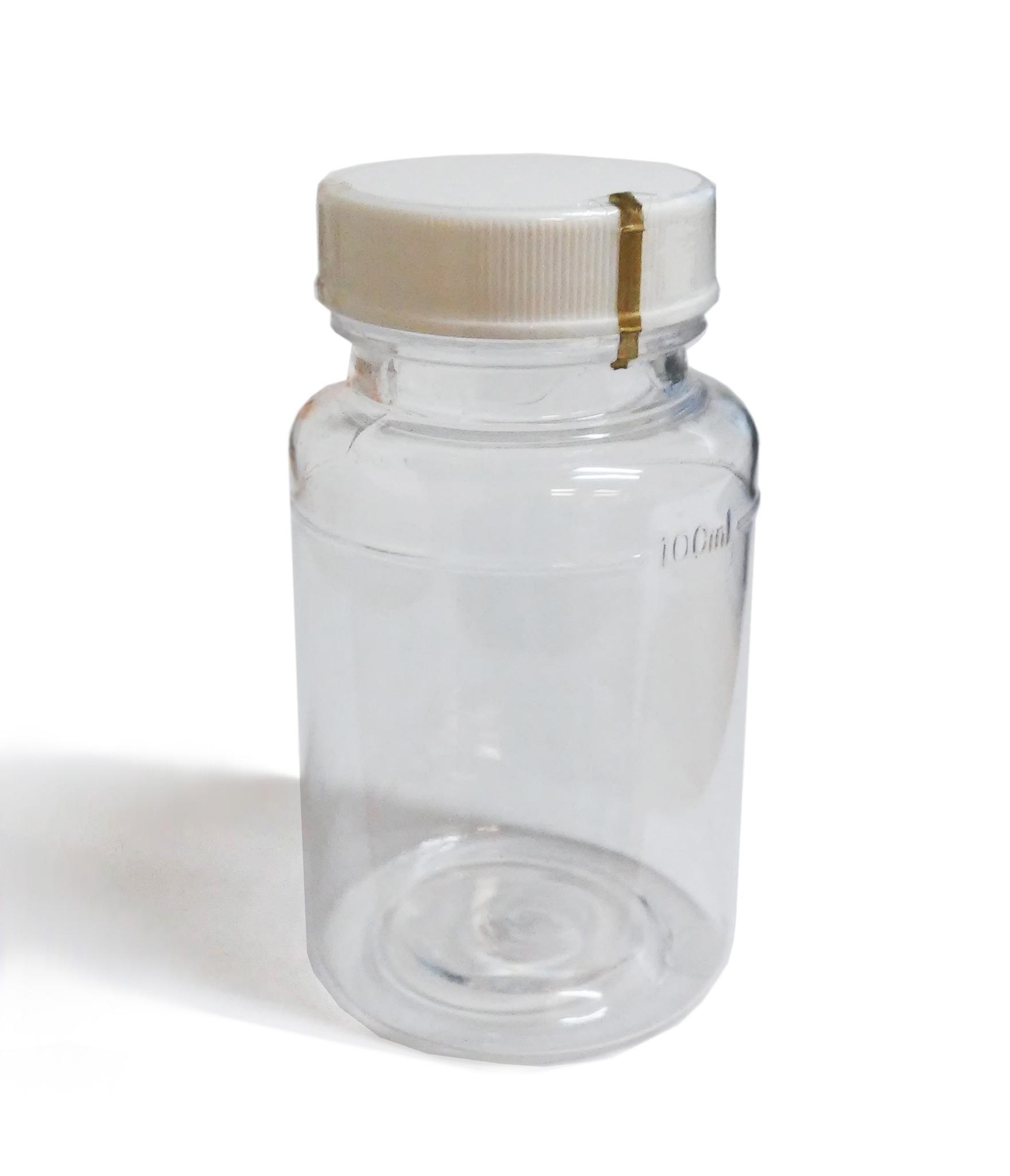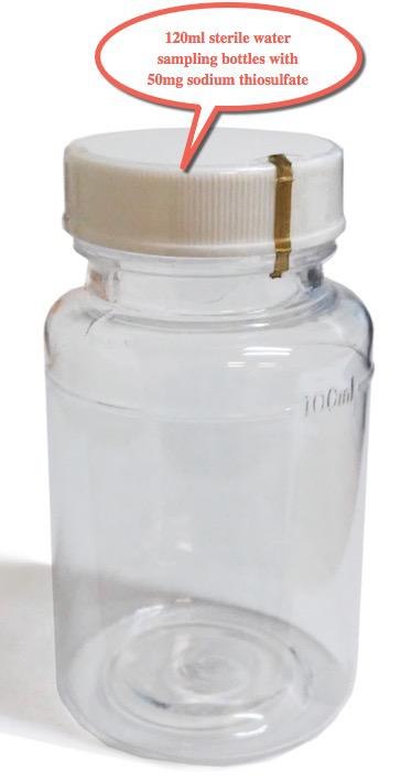 100ml Sample Bottle with Sodium Thiosulfate,Sterile,100/Case The water collection bottle is specifically designed for water potability testing that includes total coliforms and E. coli testing. It is made of polyethylene and has a convenient 100-mL fill line on a 120ml bottle. The bottle comes with sodium thiosulfate for neutralizing chlorine in potable water.